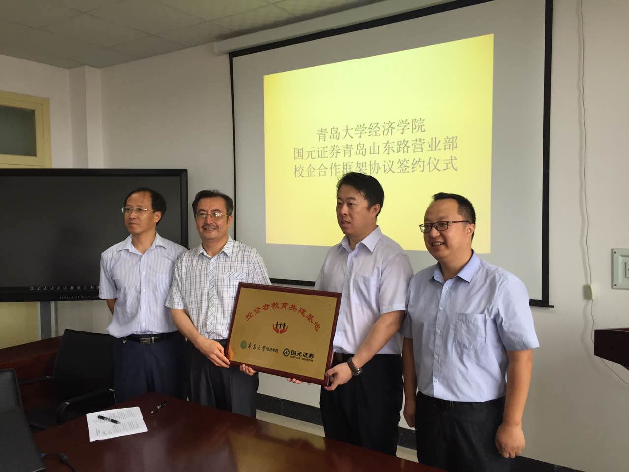 2016年7月19日上午,国元证券青岛分公司山东路营业部王磊总经理、BB贝博艾弗森官网院长周升起教授在浮山校区诚思楼504会议室签署校企合作框架协议,并为“投资者教育共建基地”揭牌。
