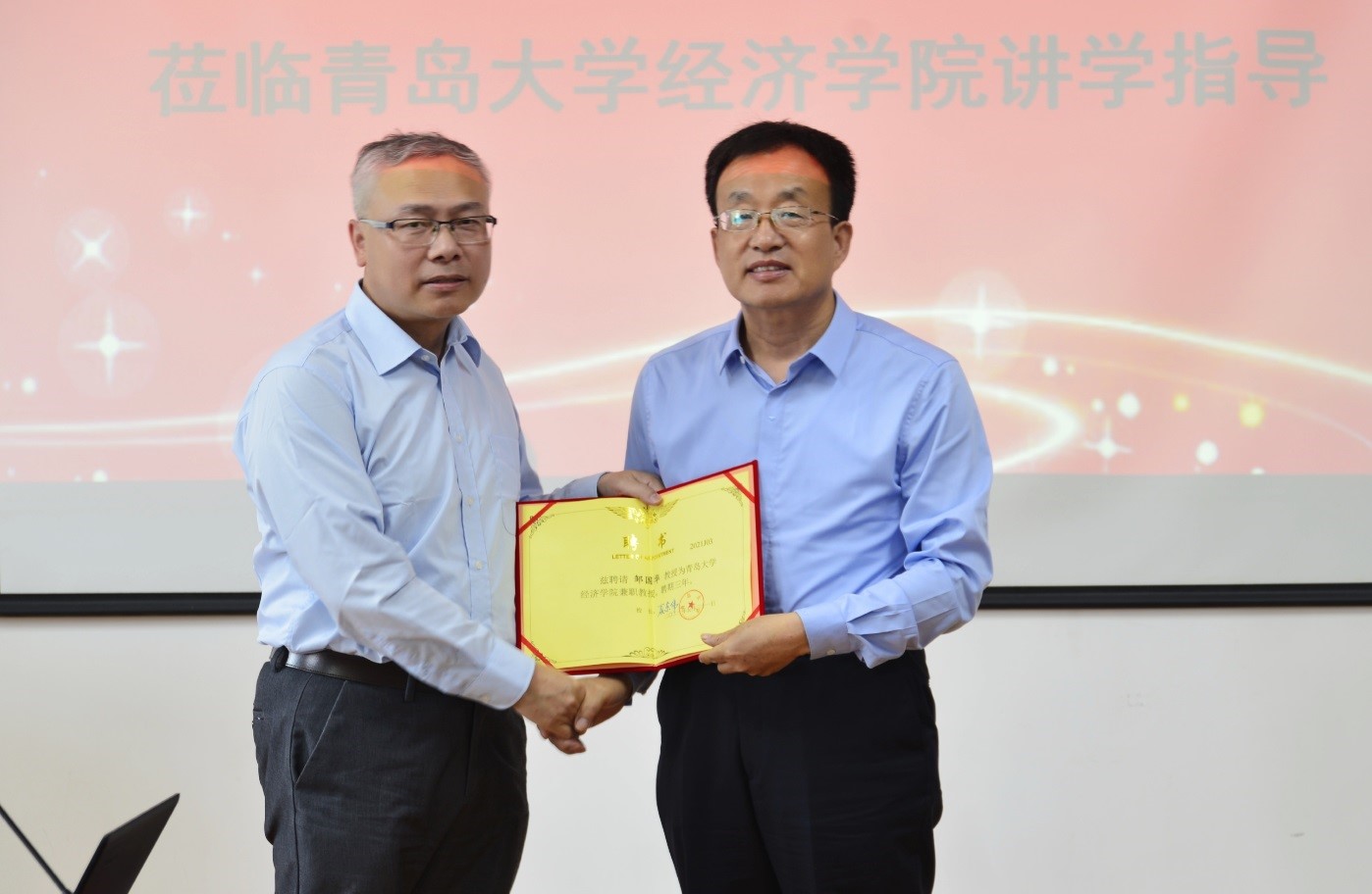 2021年5月31日下午,BB贝博艾弗森官网在金家岭校区举行了兼职教授聘任仪式,首都师范大学邹国华教授受聘为BB贝博艾弗森官网兼职教授,BB贝博艾弗森官网刘喜华院长为邹国华教授颁发了聘书。聘任仪式结束后,邹教授做客BB贝博艾弗森官网“经济学名家讲堂”,为全院师生做了《Model averaging estimation for probability density functions》的精彩学术报告,讲座由陈东景副院长主持。