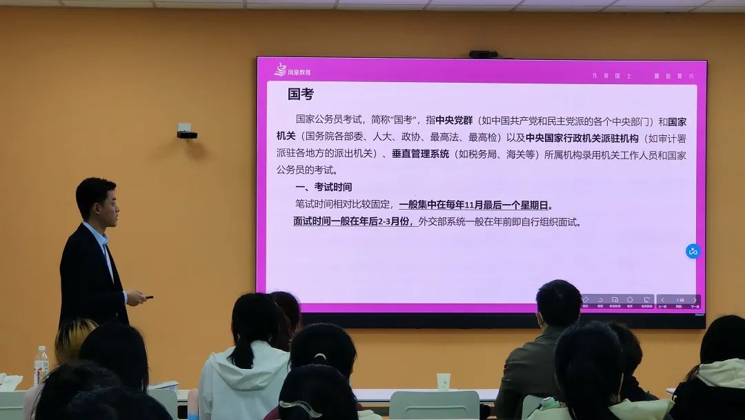 宋健老师首先详细讲解了公职类考试(国考、山东省考、选调生、事业单位、三支一扶、青选计划及其他人才引进)的重要内容,包括简介、考试时间、考试内容、题型题量、招考特点、报考条件等方面。过程中,宋健老师结合具体事例和考题,详细介绍了考试备考方法和技巧,对公务员考试的题型进行了分析,包括笔试试题的考察点及作答注意的问题。