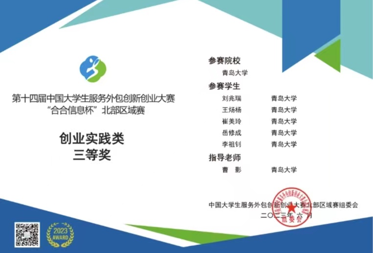 目前,第十四届中国大学生服务外包创新创业大赛“合合信息杯”北部区域赛公布了获奖名单,BB贝博艾弗森官网由曹影老师指导的学生团队荣获“创新实践类项目”三等奖。