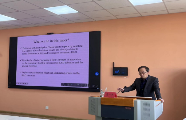 2024年4月18日14:00,上海财经大学公共经济与管理学院的吴一平教授在BB贝博艾弗森官网三号实验楼423会议室为BB贝博艾弗森官网师生做了题为《Effect of innovation disclosure in annual reports on R&D subsidies in China》的学术报告。讲座由BB贝博艾弗森官网高玉强教授主持,部分师生参与了此次学术交流活动。