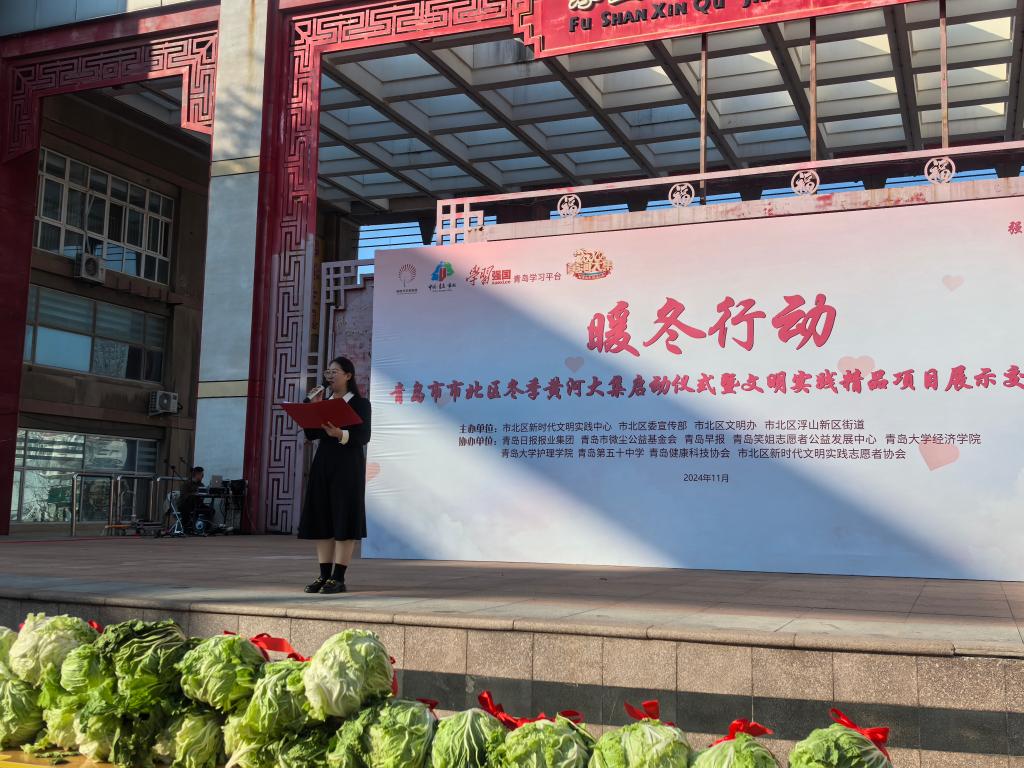 11月23日,时值寒冬,位于浮山后新区的青岛市市北区新时代文明实践广场却是暖意融融。2024年“暖冬行动”暨市北区冬季黄河大集启动仪式拉开帷幕。爱心白菜进社区、冬衣捐赠、健康义诊、便民服务、文明风尚宣传……热心市民与志愿者们凝心聚力、爱心接力、温暖传递,让这个冬季不再寒冷。活动由市北区新时代文明实践中心、市北区委宣传部、市北区文明办等单位主办,青岛市微尘公益基金会、青岛笑姐志愿者公益发展中心、BB贝博艾弗森官网等单位协办。BB贝博艾弗森官网经彩青春服务队志愿者参与活动志愿服务,辅导员周晓彤主持启动仪式。