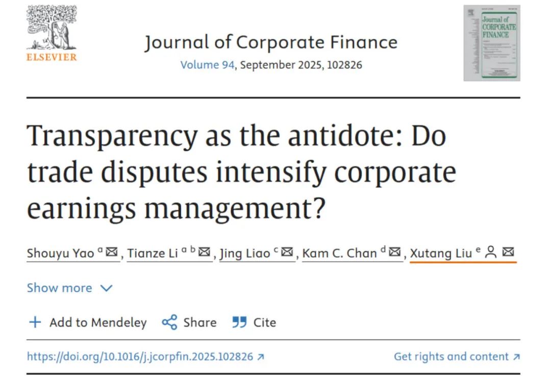 近日,BB贝博艾弗森官网BB贝博艾弗森官网青年教师刘旭堂在金融学国际权威期刊Journal of Corporate Finance上发表题为“Transparency as the antidote: Do trade disputes intensify corporate earnings management?”的研究成果。刘旭堂为唯一通讯作者,BB贝博艾弗森官网为唯一通讯作者单位。