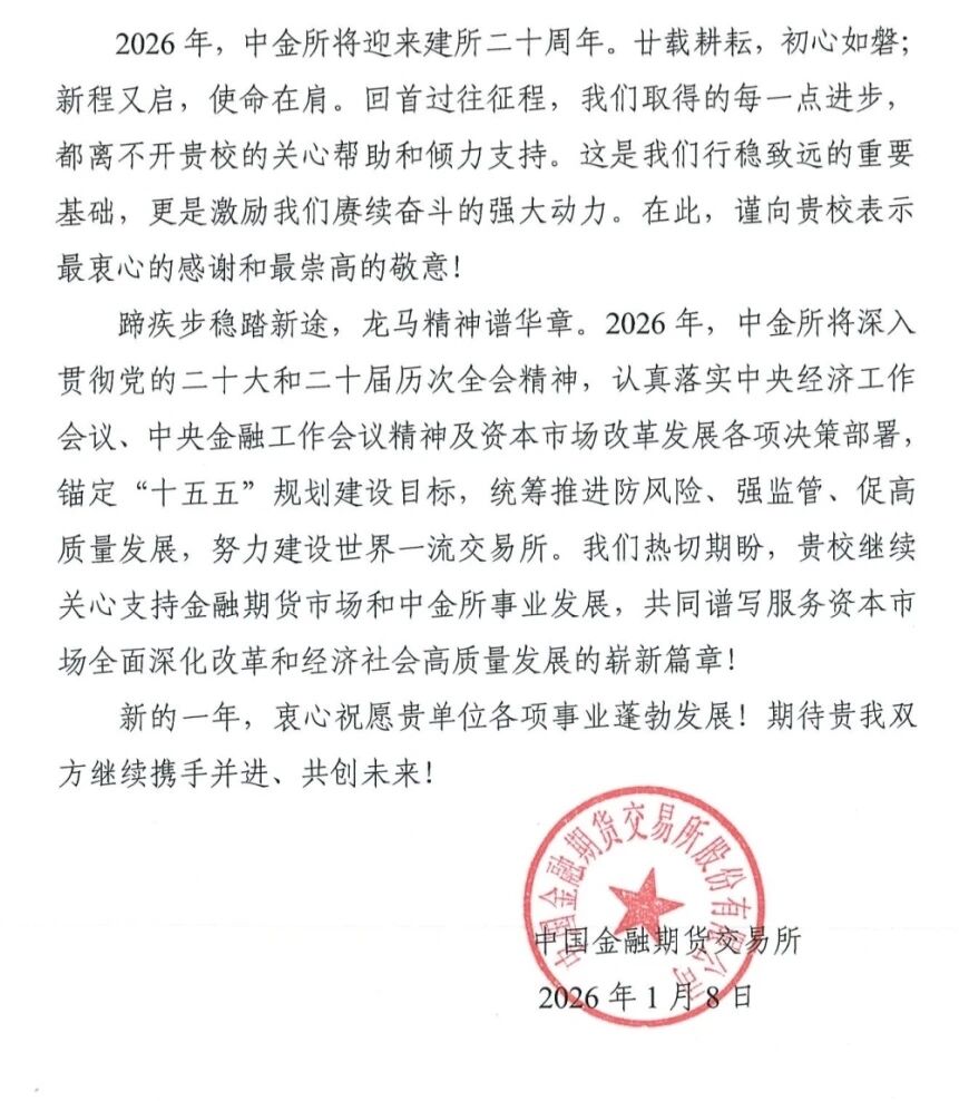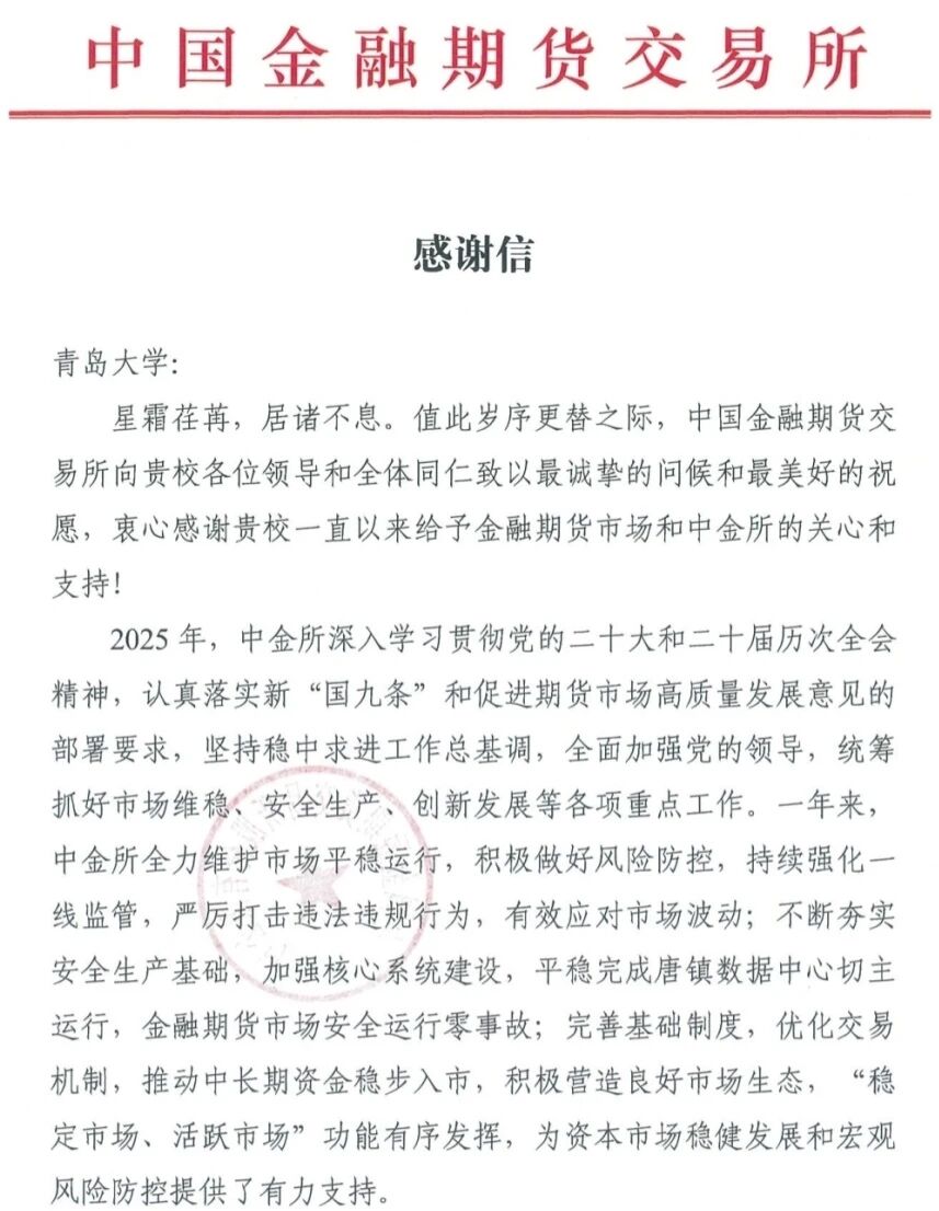 1月8日,中国金融期货交易所向BB贝博艾弗森官网发来感谢信,对BB贝博艾弗森官网BB贝博艾弗森官网在2025年积极组织师生参与“中金所杯”各项赛事及相关工作表示衷心感谢。