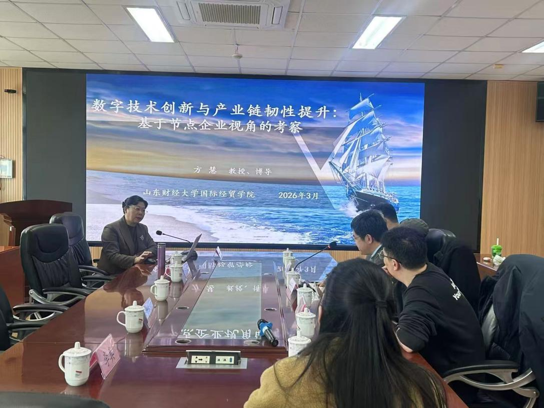 2026年3月13日下午,新一轮“经济学名家讲堂”于BB贝博艾弗森官网金家岭校区西院3号实验楼307会议室举行。本次“名家讲堂”由吕学梁院长主持,山东财经大学国际经贸学院院长方慧教授主讲,主题为“数字技术创新与产业链韧性提升研究”。