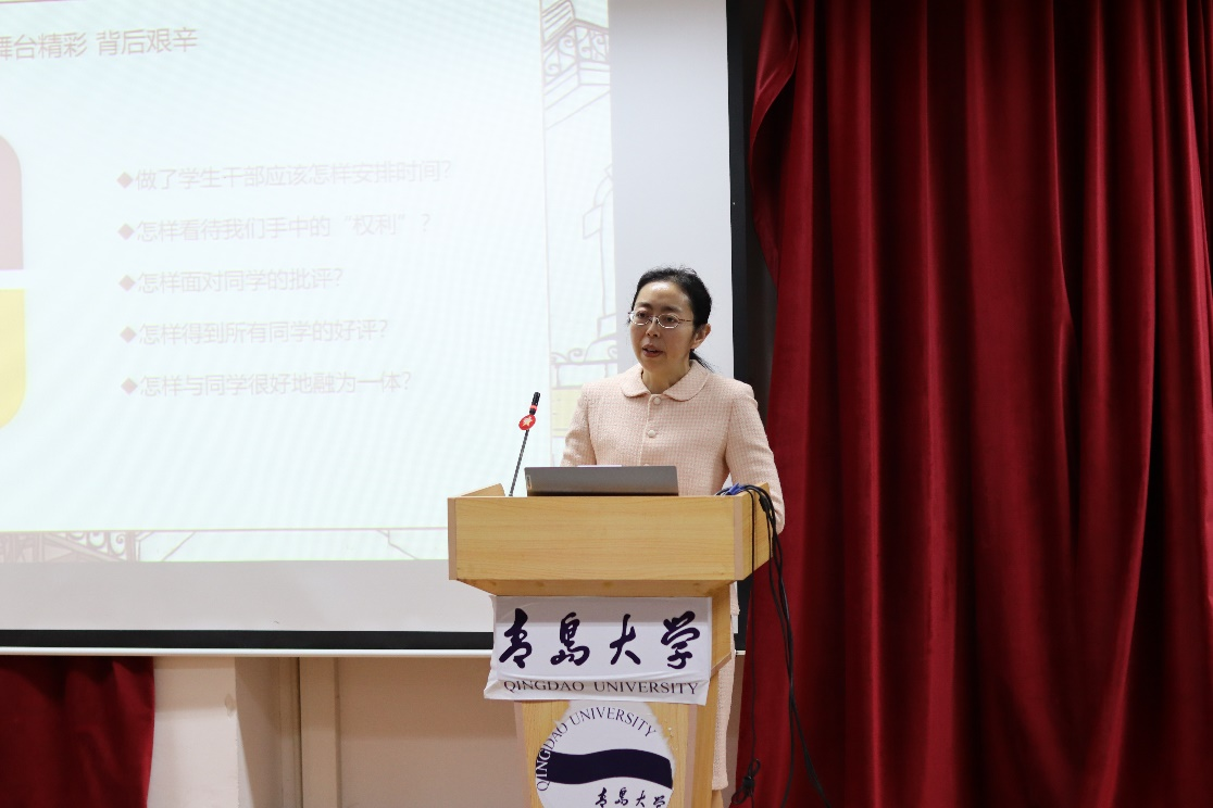 于文洁在致辞中指出,学生干部是从学生中选拔出来的骨干力量,是学校和学生之间的桥梁与纽带,是加强和改进思想政治教育的可靠力量。她向学生干部提出了三点建议和期望:一是正确把握时代的思想脉搏,坚定理想信念;二是明确自身定位,永远不失创新动力;三是珍惜当下,奏响奋斗旋律。新时代的学生干部要用新时代的标尺审视自己,在激扬青春、开拓人生、奉献社会的进程当中书写无愧于自己、无愧于时代的的人生华章。