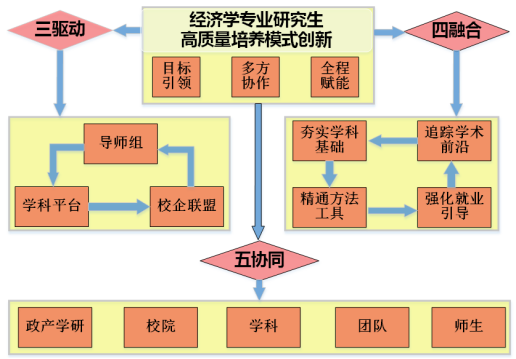 为持续提高人才培养质量,造就适应时代要求的高层次人才,BB贝博艾弗森官网在经济学专业研究生培养方面开展了全方位改革,并取得了明显成效。本成果以高水平综合性研究型大学建设为依托,以高层次人才培养为目标,聚焦经济学专业研究生专业基础能力、学术研究能力、实践应用能力的系统化提升,依托BB贝博艾弗森官网“应用经济学”一级学科博士点和“理论经济学”一级学科硕士点多年人才培养经验、学术成果积累与人才梯队建设,聚焦经济学专业“四轻”痛点——“轻知识积累的问题意识导向、轻研究能力的创新激发导向、轻知识结构的前沿追踪导向、轻实习实践的就业指引导向”,构建了“目标引领——多方协作——全程赋能”的开环人才培养体系,创新提出了“三驱动、四融合、五协同”人才培养思路,并从“课程体系优化、学术能力训练、科研平台赋能、研究团队支撑、政产学研联动”等方面,扎实推进经济学专业研究生培养体系的优化。本成果已取得良好的人才培养成效,在实践中初步实现了“厚基础知识学习、强前沿学术研究、重政产学研融合、塑综合竞争力培育”的经济学专业研究生高质量培养模式创新。成果主要体系如图1所示。